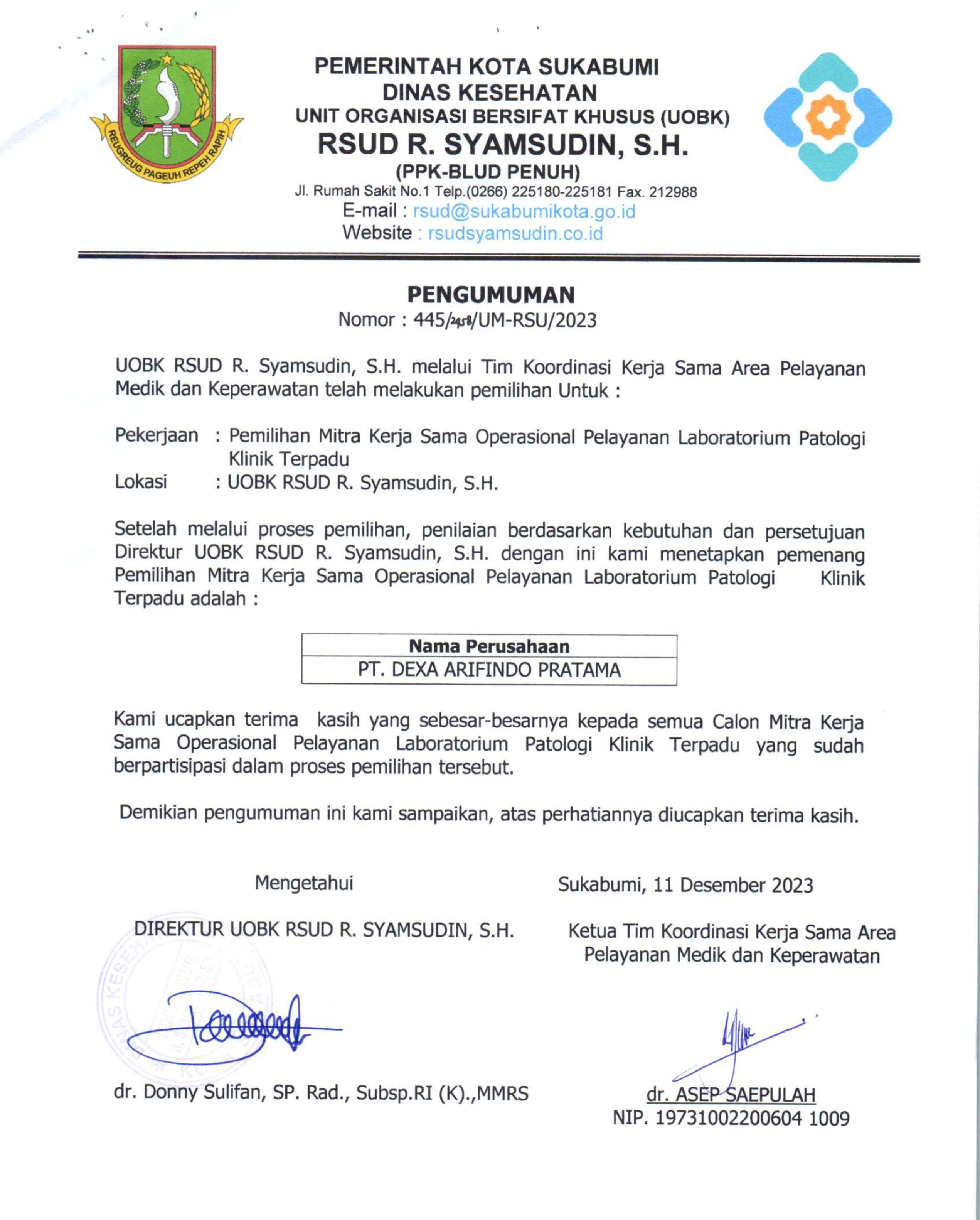 UOBK RSUD R. Syamsudin, S.H. akan melaksanakan pemilihan calon mitra Kerja Sama Operasional (KSO) Operasional Laboratorium Patologi Klinik.Untuk Lampiran Daftar Pemeriksaan Laboratorium Patologi KlinikUOBK RSUD R. Syamsudin, S.H. bisa di… lihat selengkapnya
