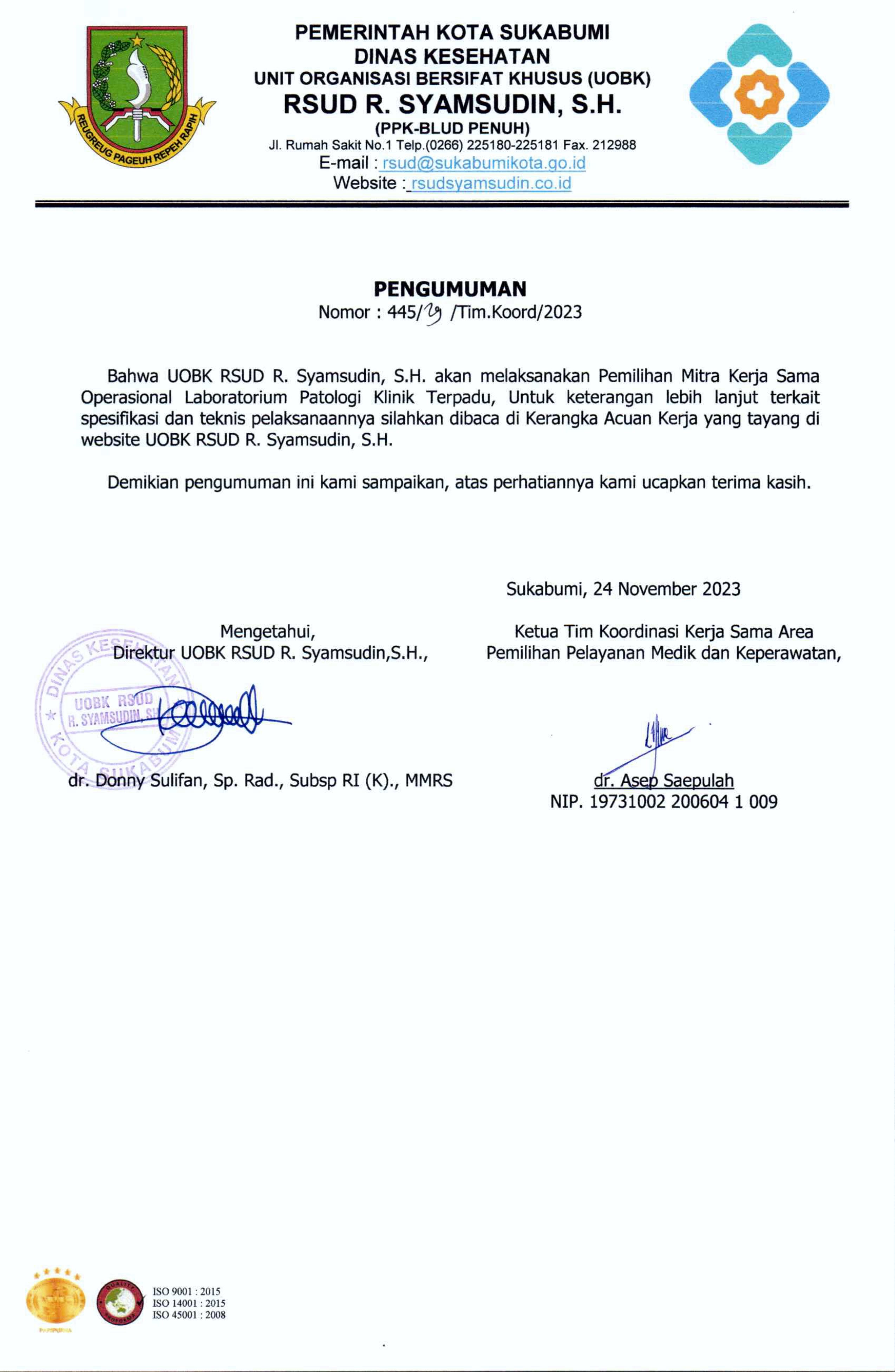UOBK RSUD R. Syamsudin, S.H. melalui Tim Koordinasi Kerja Sama Area Pelayanan Medik dan Keperawatan telah melakukan pemilihan untuk Mitra Kerja Sama Operasional Pelayanan Laboratorium Patologi Klinik TerpaduUOBK RSUD R.… lihat selengkapnya