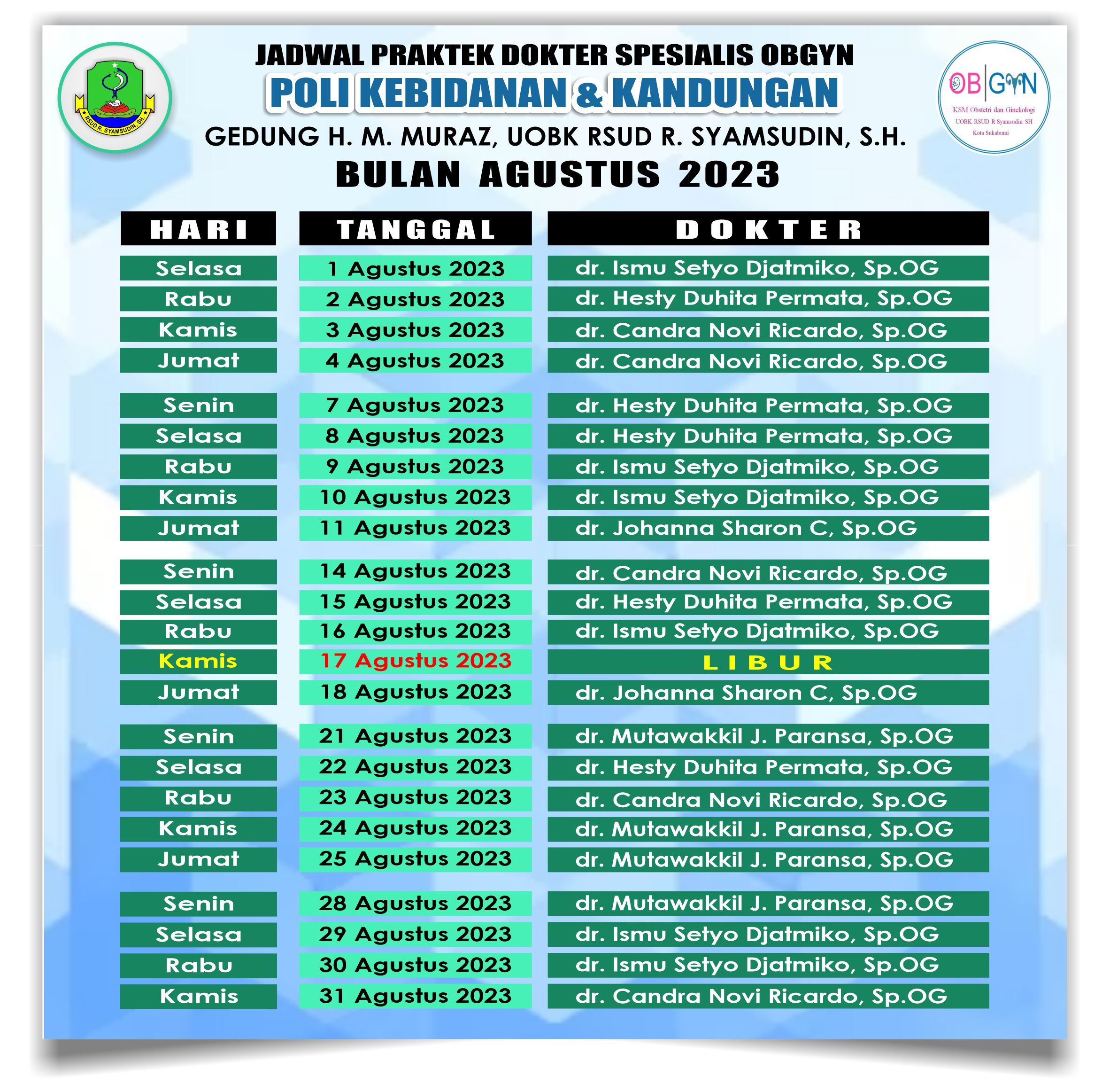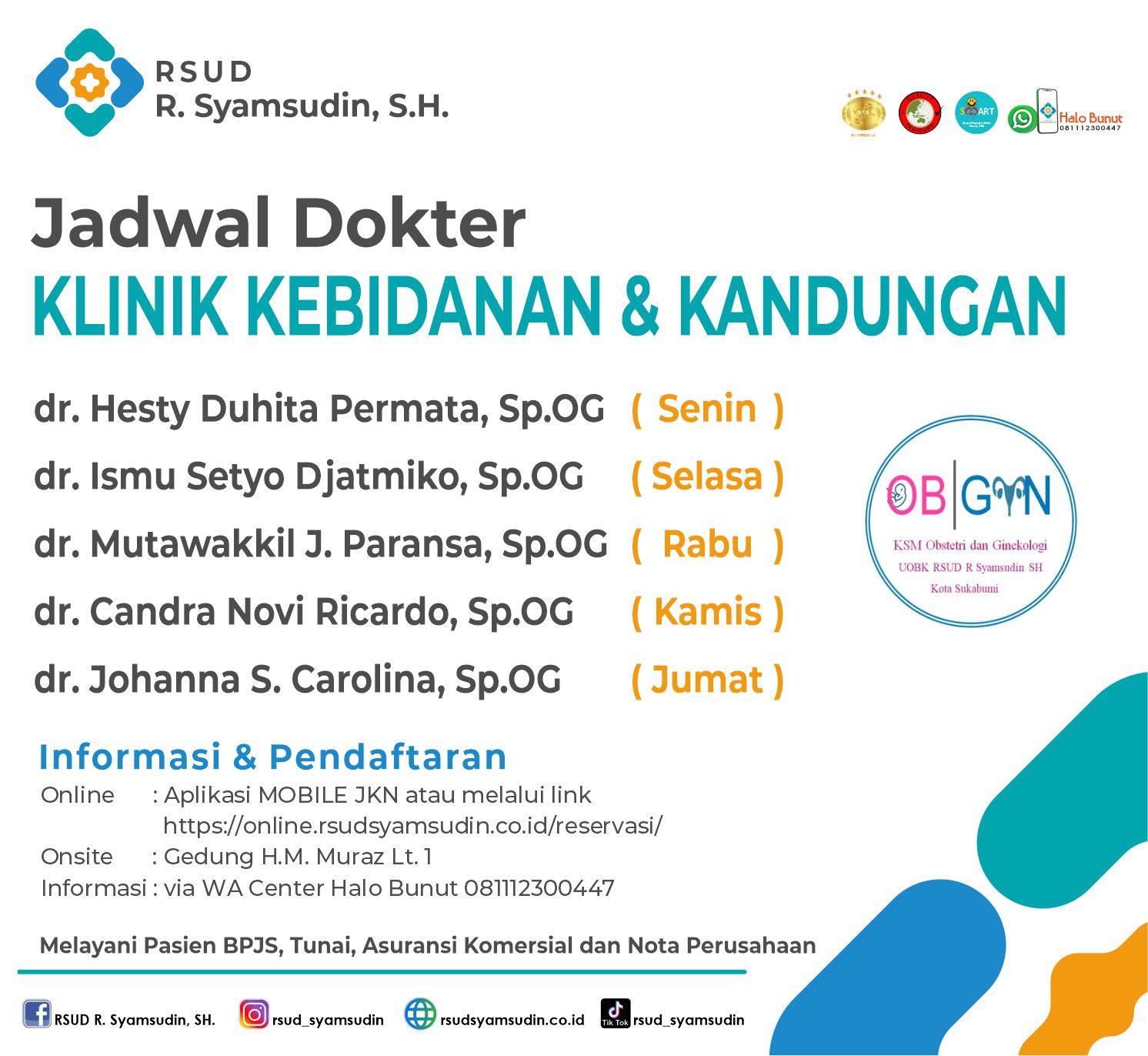 Klinik obgyn / Kebidanan dan Kandungan merupakan salah satu pelayanan Rawat Jalan yang berada di Gedung H.M. Muraz, RSUD R. Syamsudin, S.H. Kota Sukabumi,melayani pemeriksaan kehamilan, kandungan dan persalinan. Sarana… lihat selengkapnya
